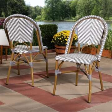 Show more Elevate your dining experience with the Baxton Studio Celie Classic French Bistro Dining Chair Set. This stunning set of two chairs features a timeless grey and white bamboo-style design that seamlessly blends elegance and functionality. Perfectly suited for both indoor and outdoor use, these chairs add a touch of French charm to your patio, terrace, or dining area. With dimensions of 21.9 x 18.5 x 34.2 inches and a lightweight build of 8.16 pounds, these stackable chairs offer both convenience and style. The unique wicker design not only ensures comfort and aesthetics but also enhances durability, making them an ideal choice for any setting. Their stackable feature allows for easy storage, making them a practical solution for your entertaining needs.