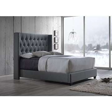 Show moreExperience the perfect blend of style, comfort, and functionality with the Baxton Studio Katherine Contemporary King Wingback Bed. This stunning bed features a chic and timeless design, combining solid rubberwood construction with luxurious grey fabric and plush foam padding. The elegant wingback silhouette, adorned with nail head trim, offers a sophisticated touch that elevates any bedroom decor. It not only provides a striking focal point but also ensures a cozy and inviting space for restful nights. With dimensions of 55.50 inches for the headboard height and 83.38 inches in width, this bed creates an impressive presence in your room while maximizing comfort and style.