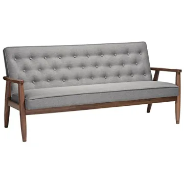 Show more Introducing the Baxton Studio Sorrento Mid-Century Retro Modern Fabric Upholstered Wooden 3-Seater Sofa, the ultimate blend of style and functionality! This stunning centerpiece is expertly crafted with a premium structure using rubberwood, MDF wood, and LVL to deliver a solid and durable frame, ensuring that it will withstand the test of time in your home or professional space. With dimensions of 29.72" D x 71.26" W x 33.27" H, this sofa fits seamlessly into various environments, from cozy living rooms to bustling office lobbies.