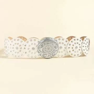 Baynoyia Women Hollow Disc Belt - Boho Concho Wide Leather Vintage Belt with Metal Buckle (Ancient White, One Size)