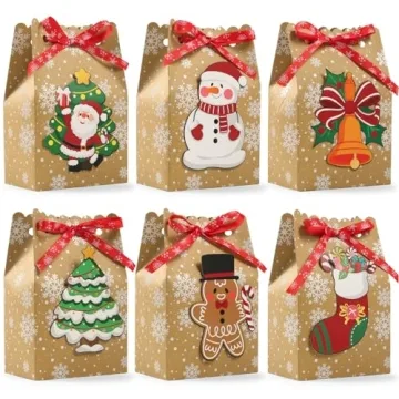BBPOOL 24pcs Christmas Goody Bags Bulk Kraft Gift Bags with Ribbons in Unique Designs