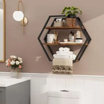 Show more Introducing our stunning Decorative Wall Shelves, designed to bring a touch of contemporary charm to any wall in your home or office. These shelves feature a unique industrial design that makes them not only functional but also a striking addition to your decor. Crafted with a robust honeycomb metal frame and premium particleboard wood, these shelves are built to endure. Their water-resistant and rust-resistant qualities ensure that they maintain their pristine look over time, allowing you to enjoy their beauty for years to come.