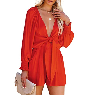 Show moreIntroducing the Bdcoco Women’s Plunge V Neck Tie Front Jumpsuit, a stylish and versatile wardrobe staple that combines comfort with a touch of elegance! Crafted from premium, soft material, this romper offers a breathable fit perfect for a variety of occasions. The deep V neckline adds a hint of allure, while the front tie closure accentuates your waist, creating a flattering silhouette. The long lantern sleeves feature smocked cuffs, elevating the design with unique detail as well as functionality when you need a little extra warmth. Two convenient side pockets add practicality, making this romper an essential item for any trendy woman's closet.