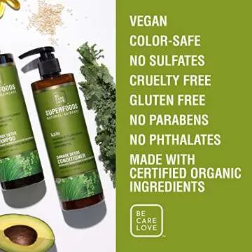 Show moreDiscover the transformative power of Be Care Love SuperFoods Damage Detox Shampoo, infused with the nutrient-rich goodness of kale. This revolutionary formula is designed specifically for those who prioritize health and sustainability, offering a hair care solution that is both vegan and vegetarian. With a blend of cruelty-free and sustainably sourced ingredients, this shampoo not only nourishes your hair but also aligns with your eco-conscious values. Each pump releases a luxurious lather that gently yet effectively cleanses while providing essential repair to damaged hair, ensuring your locks look and feel their absolute best. With a focus on clean beauty, it’s free from parabens, sulfates, phthalates, and added colors, making it perfect for sensitive scalps and environmentally-conscious consumers alike.