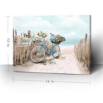 Show moreIntroducing the Beach Canvas Wall Art for Bathroom, a stunning piece that encapsulates the calming essence of seaside serenity. This exquisite canvas features a charming beach bicycle adorned with flowers, nestled against a wood-toned fence, all set against a backdrop of crystal-clear waters. The artwork masterfully balances cool shades of blue with warm natural tones, creating an inviting atmosphere perfect for your bathroom or any space in your home. Imagine the refreshing ocean vibes brought indoors, transforming your walls into a tranquil escape every day.