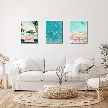 Beach Coastal Wall Art for Bathroom Ocean Pictures Seaside Palm Canvas Print Seascape Painting Pink Car with Surfboard Artwork for Modern Coastal Themed Lake Home Bedroom Decor Unframed