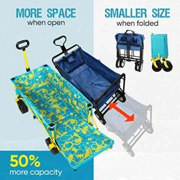 This collapsible wagon isn't just functionally impressive; it's built from high-quality materials, including a heavy-duty steel structure that can hold up to 225lbs on flat terrain and 150lbs on sand. With its user-friendly design, the wagon can be swiftly folded with a single lift of the middle strap, allowing for easy storage in your car, closet, or garage when not in use.