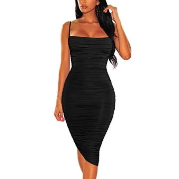Show moreIntroducing the BEAGIMEG Women's Ruched Backless Spaghetti Strap Bodycon Party Club Midi Dress, the perfect blend of style and comfort. Crafted from a high-quality mix of polyester and spandex, this stunning dress offers a soft and stretchy fit designed to hug your curves in all the right places. The ruched adjustable spaghetti straps allow for a personalized fit, while the dual ruched detailing on both sides adds an elegant touch to the overall design. Whether dressing up for a cocktail party, a club night, or a casual beach getaway, this versatile midi dress is your go-to choice for any occasion.