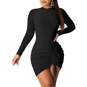 BEAGIMEG Women's Sexy Long Sleeve High Neck Ruched Bodycon Mini Party Dress Black