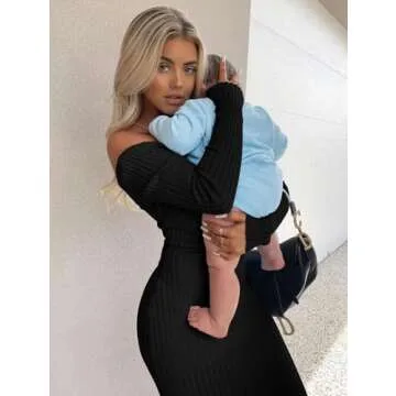 BEAGIMEG Women's Sexy Long Sleeve Off Shoulder Knit Bodycon Long Dress