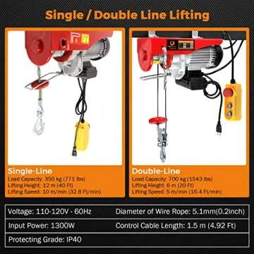 Show moreIntroducing the BEAMNOVA Electric Hoist, the ultimate lifting apparatus that's transforming the way we handle heavy loads. Rated at a robust 1543 lbs maximum weight capacity, this electric hoist operates seamlessly at 110-120 volts, making it a valuable addition to both home and workshop environments. Whether you're lifting on-site or tackling DIY projects at home, this hoist is designed to make lifting tasks easy, quick, and efficient. With its unique capability to switch between single line and double line lifting modes, you can customize it to meet different weight requirements, ensuring that whether you are hoisting boats in your boathouse or heavy equipment in your garage, this tool has you covered.