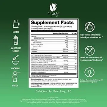 Show moreIntroducing the **Bean Envy Mushroom Powder**, a revolutionary blend that brings together the power of nature to enhance your wellness journey. This unique blend features five potent mushrooms: Lion's Mane, Reishi, Chaga, Cordyceps, and Shiitake, known for their myriad health benefits. Carefully formulated to help fortify your overall health, this powder not only supports cognitive function and immune health but also boosts energy levels and combats stress. We've incorporated enriching ingredients like MCT oil and ashwagandha, making it a powerhouse of antioxidants that fights fatigue and enhances brain function, all while being deliciously versatile.