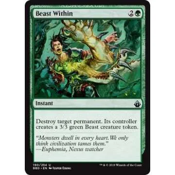 This card provides immense value due to its ability to both remove a threat and summon a creature. Compared to similar cards, Beast Within's ability to convert permanents into beasts adds an extra layer to your strategy. While other removal spells only eliminate a threat, this card not only highlights the powerful nature of green mana but also enhances your battlefield presence, making strategic play much more rewarding.