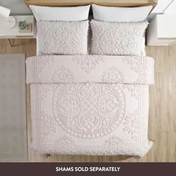 Transform your bedroom into a cozy sanctuary with the Beatrice Home Fashions Medallion Chenille Bedspread, available in a delicate blush hue. This exquisite queen-sized bedspread brings a quaint vintage charm to your decor, making it a stunning centerpiece for any bedroom. Crafted from 100% cotton, the luxurious medallion chenille fabric showcases a large centered medallion adorned with intricate scroll accents, while its bottom bell corners and elegant fringed hem provide an additional touch...