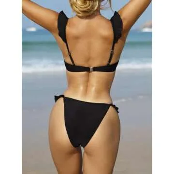 Show moreIntroducing the BEAUDRM Women's 2 Piece Plain Bikini Set—a stunning beachwear essential designed to enhance your summer experience! This elegant bikini set features a sophisticated V-neckline with charming ruffle trim, ensuring you look effortlessly chic whether by the pool or at the beach. Crafted from a breathable, soft, and skin-friendly fabric, this bikini offers high stretch for ultimate comfort and ease of movement, making it perfect for lounging, swimming, or tanning. The high-cut thong bottom and sexy triangle design flatter your silhouette while providing just the right amount of coverage, empowering you to feel confident and alluring in your own skin.