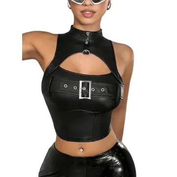 Show more Step into the spotlight with our stunning BEAUDRM Women's Faux Leather Tank Top, a captivating blend of elegance and edginess that redefines modern fashion. This high-neck, sleeveless crop top features a striking buckle front, ensuring you'll not only look fabulous but feel confident no matter the occasion. Crafted from a lightweight, skin-friendly fabric with just the right amount of stretch, this top provides all-day comfort while accentuating your curves beautifully.