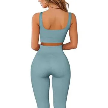Beaufident Workout Set for Women Active 2 Pieces Seamless Ribbed Yoga Leggings with Support Paded Sports Top Blue Stone