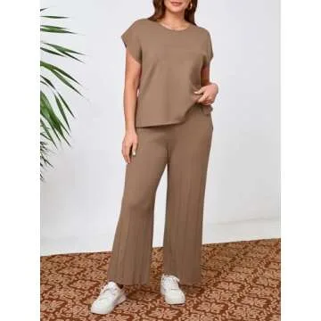 Beautife Womens Plus Size Lounge Sets Knit 2 Piece Outfits Cap Sleeve Tops and Wide Leg Pants Vacation Sweater Set Khaki