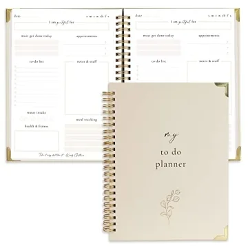 Inside, you'll find dedicated sections for to-do lists, health and fitness tracking, meal planning, and appointments, all crafted to help you manage your day with ease. The planner also encourages a healthier lifestyle by allowing you to monitor your water intake and wellness goals. With its modern minimalistic design, featuring beige color, golden spiral binding, and gold corner accents, planning becomes not just a task but a delightful experience.
