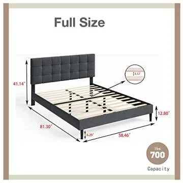 Show more Introducing the ultimate platform bed that transforms your sleep space into a haven of comfort and style. With dimensions of 81.30"L x 58.46"W x 41.14"H, this bed accommodates all your needs while boasting a remarkable weight capacity of 700 lbs. Upholstered in durable polyester linen, our bed exudes elegance and versatility, making it a perfect addition to any decor style. Its premium fabric not only enhances aesthetics but also ensures a long life cycle of usage, providing both beauty and practicality.