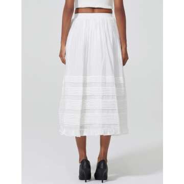 Show more The BEAUZSUZSANA Women White Maxi Boho Skirt is a stunning blend of vintage charm and modern comfort. This exquisite skirt features a double-layered design with a beautiful pleated silhouette that gracefully flows as you move, making it ideal for creating enchanting summer looks. Constructed from 100% rayon for the outer layer and soft, breathable 100% cotton for the inner lining, it ensures a lightweight, airy feel that keeps you cool no matter the temperature. Available in a chic ivory shade, this skirt is designed for elegance with its ruffled trim, making it a perfect addition to your wardrobe for any occasion.