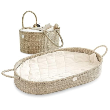 The removable components, like the changing mat and cotton liner, can be easily washed, while the woven basket can be gently wiped with a damp cloth.