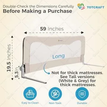 Show moreIntroducing the TotCraft Bed Rails for Toddlers & Infants, a safety solution designed specifically for ensuring your child's cozy slumber is both secure and comfortable. Measuring an extra long 59 inches by 19.5 inches, these bed rails are perfect for a variety of mattress sizes, including twin, full, queen, and king beds. Made from durable, non-toxic materials, each rail is crafted with safety in mind, featuring a metal rod structure covered by soft mesh fabric. Parents rave about the easy installation process, making it effortless to set up and take down as needed. With its sleek beige design, it seamlessly integrates into any bedroom décor while providing a reliable barrier for your little ones as they sleep. Plus, with a lifetime warranty and a money-back guarantee, you can invest in their safety with complete confidence!