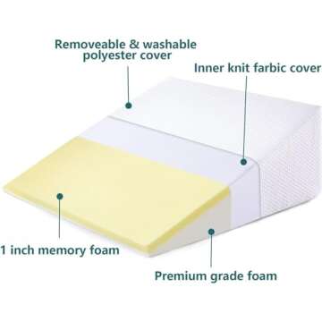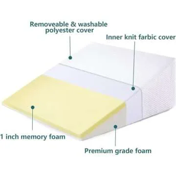 Show more Introducing the ultimate solution for restful sleep and comfortable relaxation, our Comfortable Foam Wedge Pillow. This exceptional product is designed to offer a soothing incline that not only elevates your head and torso but also alleviates discomfort from various conditions such as snoring, acid reflux, and back pain. Crafted with 1 inch of top memory foam and a high-density medical-grade foam core, this pillow supports your head and neck, ensuring a perfect balance between softness and firmness for a restorative night's sleep.