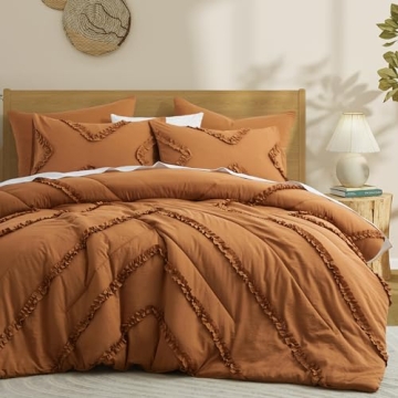 Show more Transform your bedroom into a sanctuary of comfort and style with the BEDAZZLED Queen Comforter Set. This exquisite 5-piece set features a plush pumpkin brown ruffle comforter, designed to bring both warmth and elegance to your space. Crafted with soft polyester fibers, this comforter promises a cozy night’s sleep, even as temperatures fluctuate. Its lightweight and breathable design makes it perfect for year-round use, enveloping you in a cloud-like softness that you and your family will adore. The charming ruffle details add a touch of vintage chic to your decor, making your room not only feel more comfortable but also look more inviting.