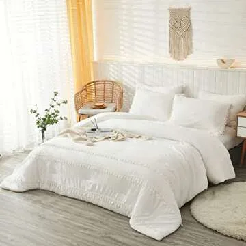 Bedbay White Queen Comforter Set Boho Bedding Comforter Full Size Luxury Tufted Tassel 3 Pcs Ultra Soft Lightweight Comforter Set Farmhouse Style (White, Queen)
