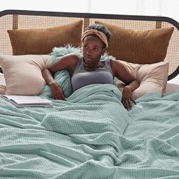 Show more Introducing the ultimate companion for your cozy nights—the Waffle Weave Cotton Blanket. Crafted from 100% premium long staple cotton, this remarkable blanket is designed to elevate your comfort and style. Its gentle hand feel gets even softer after each wash, ensuring that you feel wrapped in luxury every time you snuggle up. The breathable and moisture-absorbing properties of the fabric keep you warm without overheating. Imagine curling up with this blanket on a chilly evening, enveloped in its calming softness, perfect for relaxing nights at home or movie marathons on the couch.