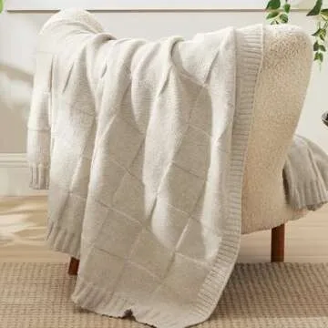Bedsure Knitted Throw Blanket for Couch - Checkered Blanket for Summer, Soft Cozy and Lightweight Chunky Knit Blanket, Beige Throw Blanket for Living Room, 50x60 Inches