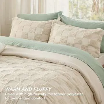 Bedsure Queen Size Comforter Set Beige, Boho Tufted Bed Set, Checkered Farmhouse Shabby Chic Bedding, 3 Pieces, 1 Plaid Geometric Comforter and 2 Pillow Shams