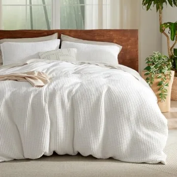 Show moreTransform your bedroom into a sanctuary of comfort and style with the Bedsure Waffle Duvet Cover King. Crafted from a luxurious blend of 50% cotton and 50% rayon derived from bamboo, this duvet cover set is designed specifically for hot sleepers. The breathable and moisture-wicking properties ensure a cool, dry night's sleep, making it an ideal choice for those who often feel overheated at night. Its classic waffle weave design not only elevates your decor with a vintage charm but also adds a sophisticated texture to your bedding collection. The stone-washed finish enhances the softness of the fabric, resulting in a cozy feel that you'll love to snuggle up in. Measuring 104" x 90", this set includes one duvet cover and two pillow shams, making it a perfect fit for your king-sized bed.