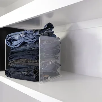 Show more Transform your cluttered spaces into organized havens with the Bee Neat Closet Organization Acrylic Clear Shelf Dividers. Designed for excellence, these shelf organizers measure 11¼ inches tall and 11⅝ inches deep, making them the perfect solution for keeping your clothes, towels, sweaters, purses, books, and other personal items neatly separated and accessible. Crafted from robust acrylic, these dividers not only enhance your home’s aesthetics with their elegant, crystal-clear look but also offer remarkable functionality that metal dividers can’t match.