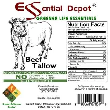Show more Introducing our premium Beef Tallow – a game changer for cooking enthusiasts and artisans alike! Packaged in a convenient 112 oz rectangular pail, this fantastic tallow is derived from grass-fed cattle, ensuring you're getting a product that is not only non-GMO but also free from harmful additives like lactose, gluten, and BSE. Shipped in a safety-sealed HDPE container with a resealable lid, this tallow offers easy access and secure storage, making it an ideal choice for creative culinary endeavors.