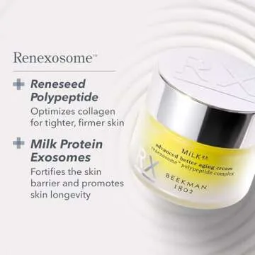 Show more Experience the rejuvenating power of Milk RX Advanced Better Aging Cream by Beekman 1802, a doctor-formulated and dermatologist-approved moisturizer that sets a new standard in anti-aging skincare. This premium cream is designed to deliver 4x the potency of traditional retinol without inducing irritation, making it perfect for sensitive skin. Infused with a breakthrough proprietary ingredient, Renexosome, which harnesses the power of Milk Protein Exosomes and Reneseed Polypeptide, this formula effectively lifts, firms, and boosts collagen production by up to 31%. Say goodbye to dull, aging skin as it visibly enhances the thickness of the epidermis.