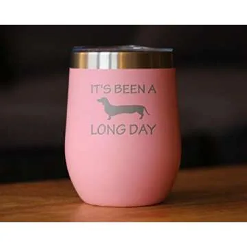 Been a Long Day - Dachshund Wine Tumbler with Sliding Lid - Stemless Stainless Steel Insulated Cup - Cute Funny Mug for Coworkers or Boss - Pink