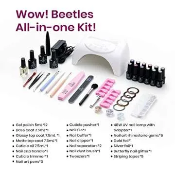 Show more Discover the ultimate way to pamper yourself and unleash your creativity with the upgraded Beetles Gel Nail Polish Starter Kit. This all-in-one kit is a complete nail art solution that includes everything you need to create stunning manicures at home. Featuring a powerful 48W LED Nail Lamp, this set effectively cures gel polish in record time, allowing you to enjoy beautiful nails without the hefty salon price tag.