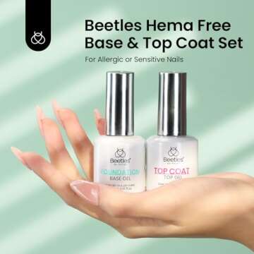 Show more Enhance your nail care routine with the Hema-Free Gel Base and Top Coat Set from Beetles. This innovative set is designed with healthier ingredients, allowing you to pamper your nails without the worry of HEMA allergies. Whether you're a nail art aficionado or just starting your DIY journey, this kit brings the salon experience to the comfort of your home.
