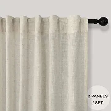 Show more Transform the ambiance of your living space with our exquisite linen curtain panels. Each package includes two beautifully crafted curtain panels, each measuring 38 inches wide by 84 inches long, providing ample coverage for your windows. What sets these curtains apart is their versatile 3-way hanging options, allowing you to achieve a personalized look. You can hang them using back loops for an elegant pleated effect, from a classic 3-inch rod pocket, or with clip rings for easy sliding—(clip rings not included).