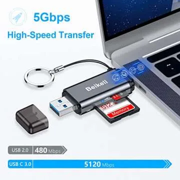Show more Discover the ultimate solution for your memory card needs with this innovative SD Card Reader, featuring fast transfer speeds that make file transfers a breeze! This remarkable gadget allows you to read data from memory cards and quickly transfer it to any OTG-enabled device, such as your computer, tablet or smartphone. With data transfer speeds of up to 5 Gbps, say goodbye to lengthy waiting times and hello to efficiency!