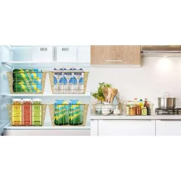 Show moreIntroducing our exceptional wire storage baskets, designed with both functionality and elegance in mind. This set comprises four medium-sized baskets (11(L) x 8.7(W) x 4.7(H) inch), perfect for maximizing storage while keeping your space organized. Whether you need to tidy up your pantry, organize toys, or store craft supplies, our versatile baskets will meet your daily needs effortlessly.