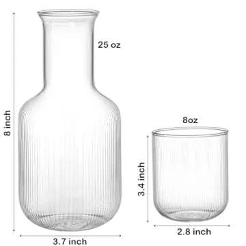 Show moreIntroducing the Bekith 2 Set 25 OZ Bedside Night Water Carafe with Tumbler Glass, an exquisite addition to your home or guest room designed for those who appreciate elegance and functionality. Crafted with premium food-grade glass, this stunning 4-piece set includes two beautifully constructed carafes and two matching cups, ensuring you and your guests always have access to refreshing beverages. With a capacity of 25 oz, the carafe stands gracefully at 8 inches tall, paired with cups that hold up to 8 oz each. The vertical stripes on the clear glass add a modern touch, perfectly complementing any decor while keeping your water clean and inviting for those late-night thirst quenchers.