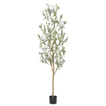 Show more Bring a touch of the Mediterranean to your home with the enchanting Bellacat Faux Olive Tree. Standing a majestic 6 feet tall, this artificial greenery piece features a realistic trunk made from natural wood, beautifully complemented by lifelike silk leaves adorned with meticulously crafted 6 colors of fruits, perfectly mimicking the essence of a real olive tree. An elegant addition to any space, this faux tree effortlessly merges sophistication with natural beauty, ideal for those seeking instant style without the hassle of maintenance.
