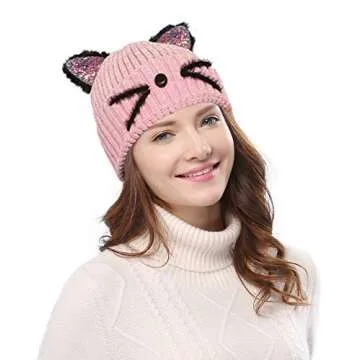 Bellady Mother Children Sequin Cat Ears Hats Warm Knit Crochet Beanies Cute Fashion Skull Cap, Adult_Pink
