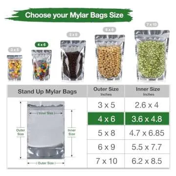 Show more Introducing our Premium Quality Small Mylar Bags, the ultimate solution for keeping your food fresh and organized! Each bag measures 4x6 inches and is expertly crafted from food-grade material with a thickness of 3.75mil on each side, ensuring durability and reliability. These are not just typical storage pouches; they are multipurpose and designed for convenience. Whether you’re storing snacks, candies, or freeze-dried goods, these bags are here to help you stock up without mess.
