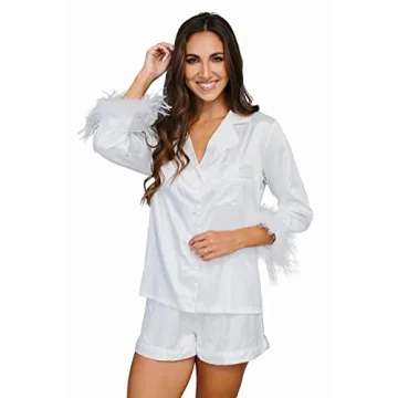 Show moreStep into a world of elegance and comfort with the Belle's Design Feather Bridal Pajamas. Crafted with the modern bride in mind, these stunning pajamas combine luxurious softness with a touch of glamour, ensuring you feel as beautiful as you look on your special day. The exquisite feather detailing along the sleeves and pant hem adds a unique flair that makes these pajamas perfect for bridal parties, pre-wedding events, or simply relaxing while preparing for the big day. Available in a chic white hue, they beautifully complement your bridal aesthetic, while their one-size-fits-all design caters to a variety of body types. Indulge in unparalleled comfort and style that makes getting ready for your wedding all the more memorable.