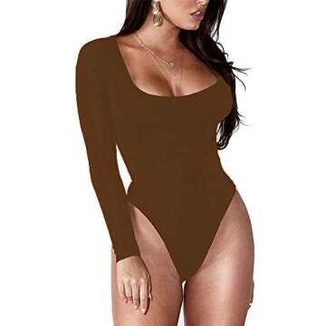 BelleLovin Women's Square Neck Long Sleeve T-shirt Basic Bodysuit Jumpsuits (Brown, Small)