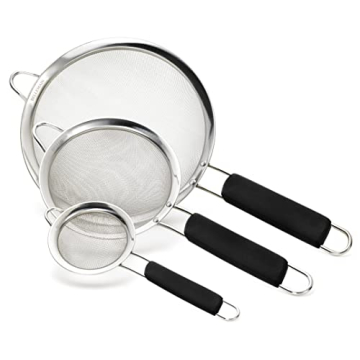 Show more Introducing the Bellemain Fine Mesh Strainer Set, a culinary essential for every kitchen! This remarkable set of three strainers—small (3.4 inches), medium (5.5 inches), and large (7.5 inches)—offers the versatility you need for all your cooking tasks. Whether you're brewing the perfect cup of tea, rinsing grains, sifting flour, or draining pasta, these strainers make the process a breeze. Crafted from premium stainless steel, they are designed to withstand heavy foods and repeated use without bending, breaking, or rusting.